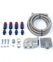 Tässä sarjassa kaikki tarvittavat osat Full Flo-suodatinjärjestelmään. Teräspunosletku AN-liittimineen, öljyn ulosotto sekä suodattimen liitoslaippa.