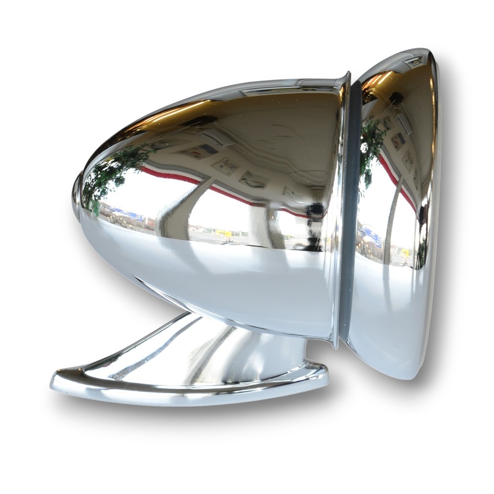 Tyylikäs kromattu aero-mallinen ovipeili, joka viimeistelee 1950–60-luvun urheiluhenkisen ilmeen. Sopii täydellisesti Karmann Ghialle ja myös moniin muihin klassikoihin.