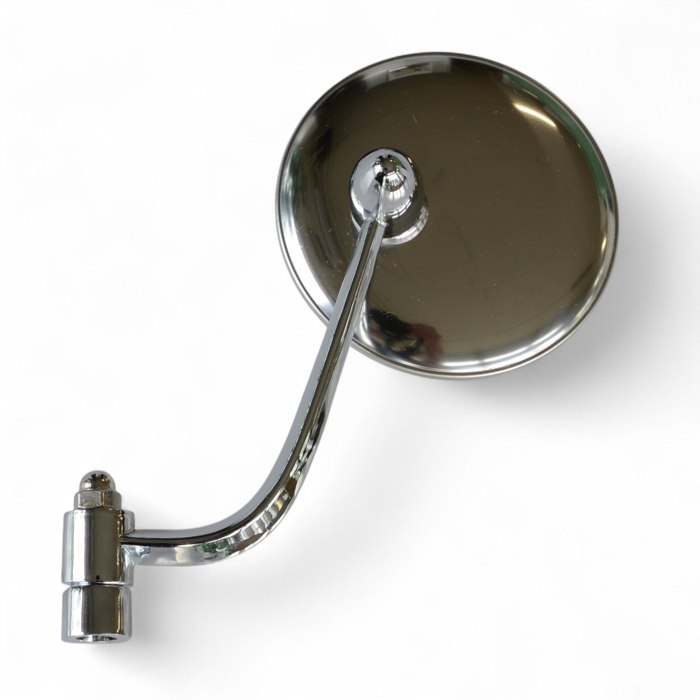 Klassinen pyöreä kromipeili Volkswagen T2 (1950–1967) -malleihin. Kiinnittyy suoraan peilin varteen, joka toimii oven saranatappina – alkuperäistyylinen ja siisti ratkaisu.